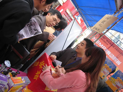 排隊簽到,不過這位小姐昨晚可能睡得不太好哦