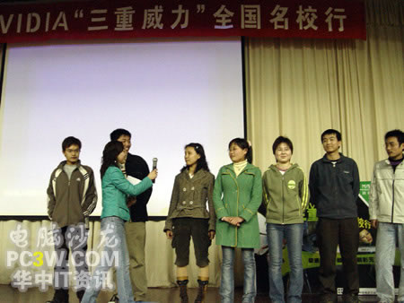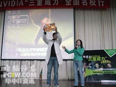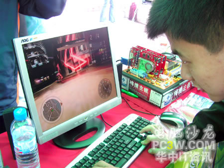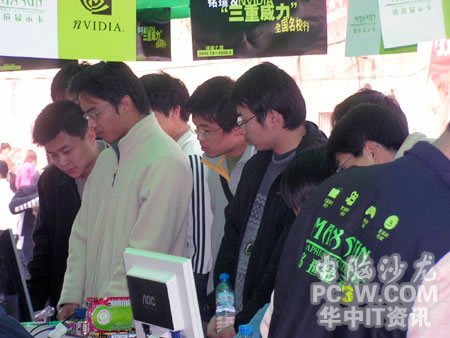 校園行也力圖讓廣大學(xué)生真實(shí)的體驗(yàn)來自NVIDIA的強(qiáng)大新技術(shù)所帶來的震撼效果,特別是SM3.0、HDR以及SLI這三大顯示技術(shù)。產(chǎn)品展臺(tái)上擺滿了各款銘瑄支持這“三重威力”的顯卡產(chǎn)品。從入門級(jí)的6200TC直到最近被各大IT媒體所熱炒的6800GS,展示產(chǎn)品可以說是琳瑯滿目。