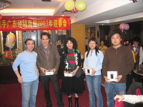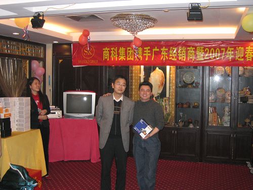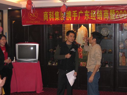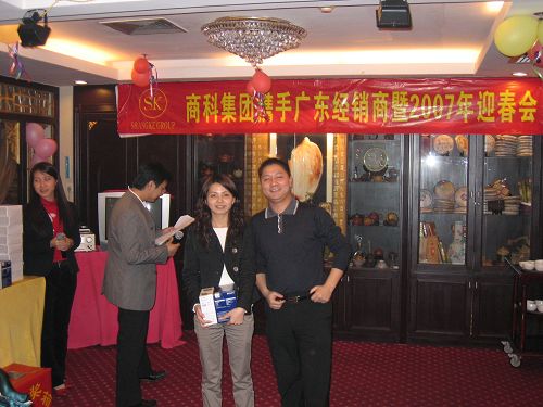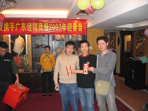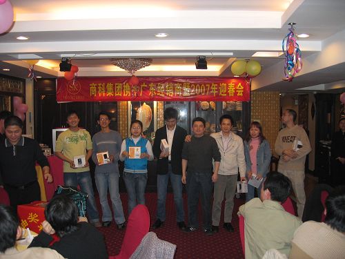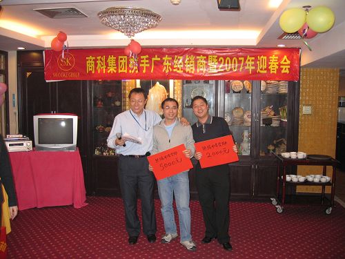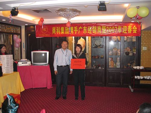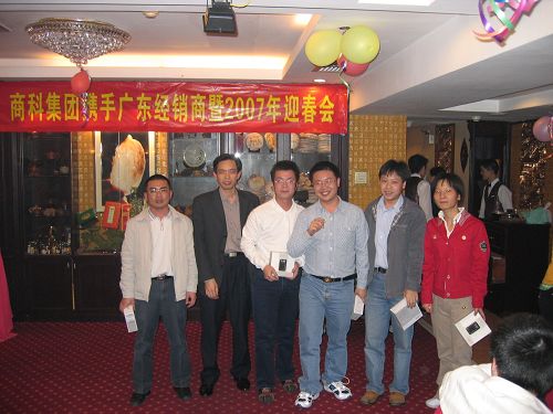 2月1日廣州商科為了答謝經銷商在過去的一年中給予的支持和厚愛,在廣武酒店舉辦了"商科集團攜手廣東經銷商2007年迎春會",與會的不僅有廣州的經銷商還有商科集團各事業部的經理.本次除頒發了"2006年度優秀個人貢獻獎" "2006年度優秀合作伙伴獎"外還進行了幸運大抽獎,現場氣氛異常熱烈……