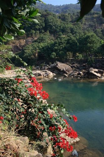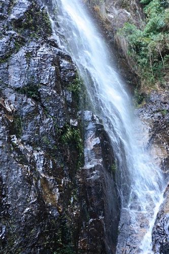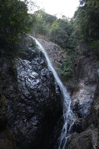 南昆山西南面的石峽山。峽谷盡頭,懸崖峭壁,約有20米高。該瀑布四季不斷,每年汛期,更為壯觀。游人沿著石階拾級而上,未到景點(diǎn),先聞瀑聲。站在距瀑布近10米的涼亭上,水花濺落周身,暑氣頓消。由于我們?nèi)サ氖墙炝耍钥吹降木吧]有像上面描述的那么美。