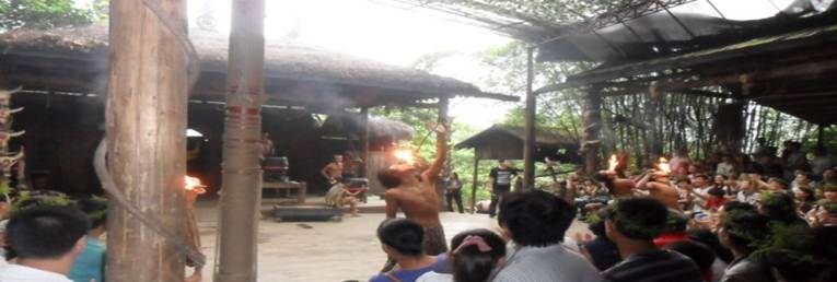 在節奏明快的“妖鼓”下,穿著色彩斑斕的獸皮,手持鋒利的長矛在山林里狩獵,燒蛇烤蚌為食,長唱著人與自然和諧的漓江漁歌和桂山獵謠。在這里,可以見證萬年前桂林甑皮巖人的生活,品味靈山秀水后歷史的滄桑與厚重,并見識現代社會原始部落的粗獷,感覺率真淳樸的土人的神秘和玄奇。