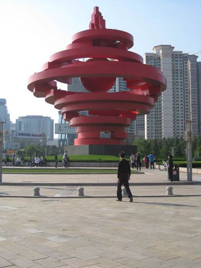 標志性雕塑“五月的風”,以螺旋上升的風的造型和火紅的色彩,充分體現了“五四運動”反帝、反封建的愛國主義基調和張揚騰升的民族力量。