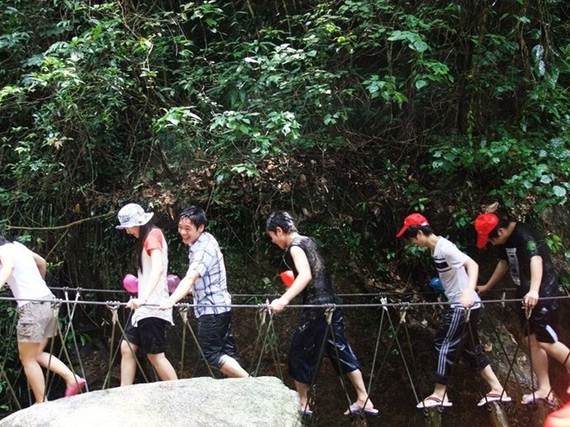 走進銀盞谷,第一節目就是森林溯溪探險,從山腳一路溯溪而上,走獨木橋穿鐵索沿水流彎彎曲曲到達山頂,可能急著去漂流一路上走馬觀花然后沿山路而返,進行今天最重要的節目------黃龍峽漂流!