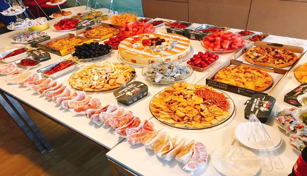 這一波豐富多樣的美食,蛋糕,披薩,月餅,水果,糖果…肚子表示抗議了啦!