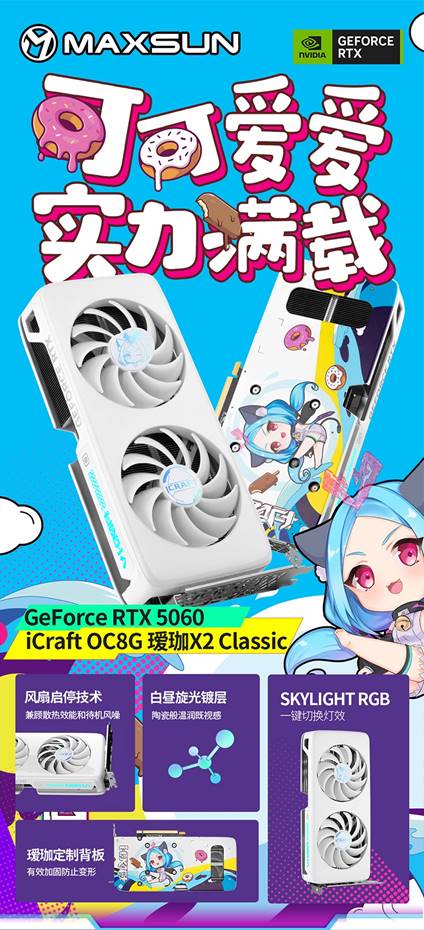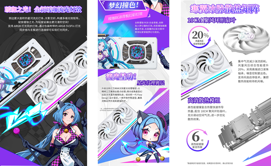 外觀上,純白PC導風罩融合定制白晝旋光鍍層,陶瓷般的細膩質感搭配表面硬化層,耐磨抗老化,流線型設計取代了上代的棱角分明,更顯精致。合金背板有效加固顯卡,防止變形延長壽命,Q 版璦珈形象搭配鮮艷糖果配色,萌趣十足,與正面簡約白外觀完美契合。散熱方面,聚風環形扇葉與優化散熱模塊確保穩定散熱,第四代流體力學滾珠風扇更符合空氣力學,相較上一代風量提高 18%、風壓提高 4%,同等轉速下噪音更低。更貼心的是,550W 以上電源即可支持運行,進一步降低入門門檻。
