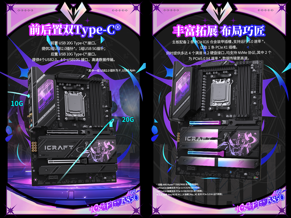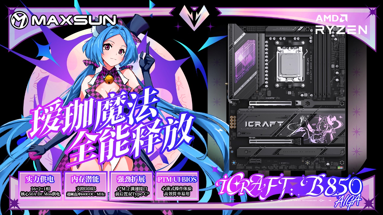 如果說AMD銳龍 7 9850X3D 處理器是性能核心,那銘瑄iCraft B850 AIGA主板就是為其量身定制的 “魔法戰甲”。它將二次元美學與旗艦級硬件規格深度融合,讓裝機不僅性能強悍,顏值更是賞心悅目,成為顏值黨與硬核玩家共同追捧的心頭好。