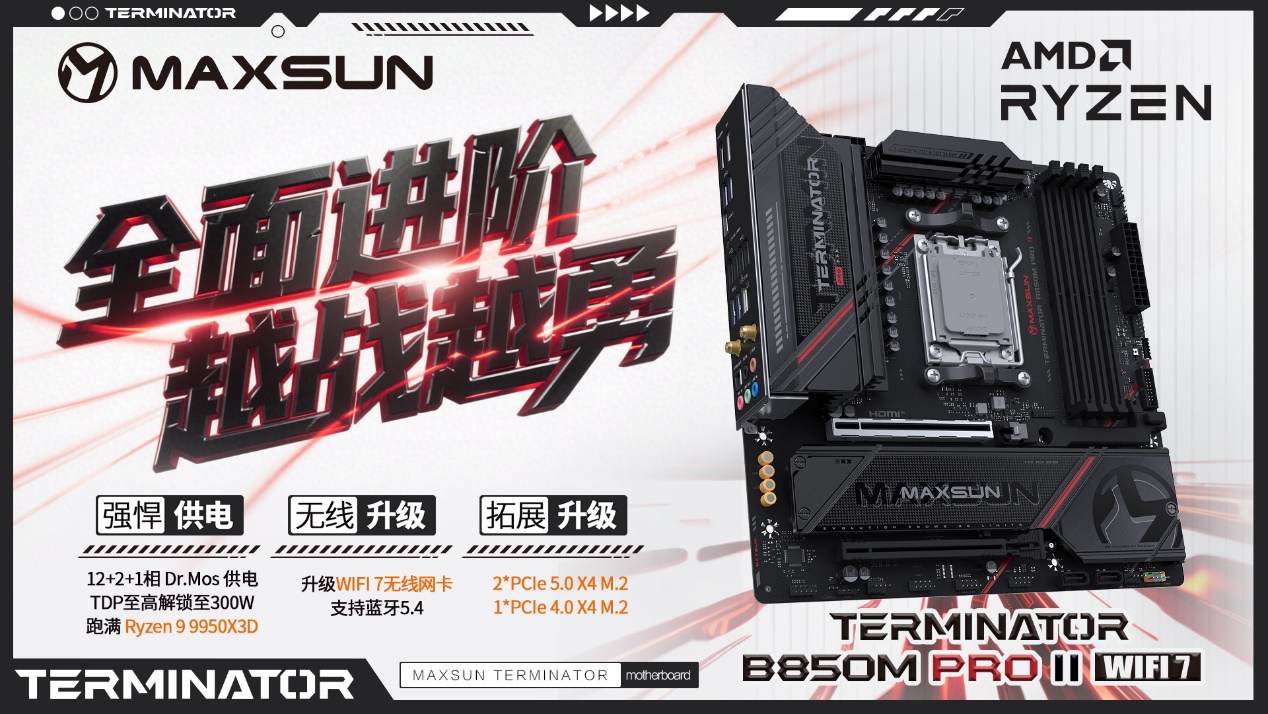 對于追求硬核性價比與實用性能的玩家來說,銘瑄Terminator B850M PRO II WIFI7 主板無疑是駕馭AMD銳龍 7 9850X3D 處理器的黃金搭檔。作為終結者系列的迭代升級之作,它在外觀、拓展、網絡等維度全面進化,以更硬核的配置和合理的價格,成為硬核裝機的性價比優選,讓玩家能以合理的價格就能享受AMD銳龍 7 9850X3D處理器帶來的高性能體驗。
