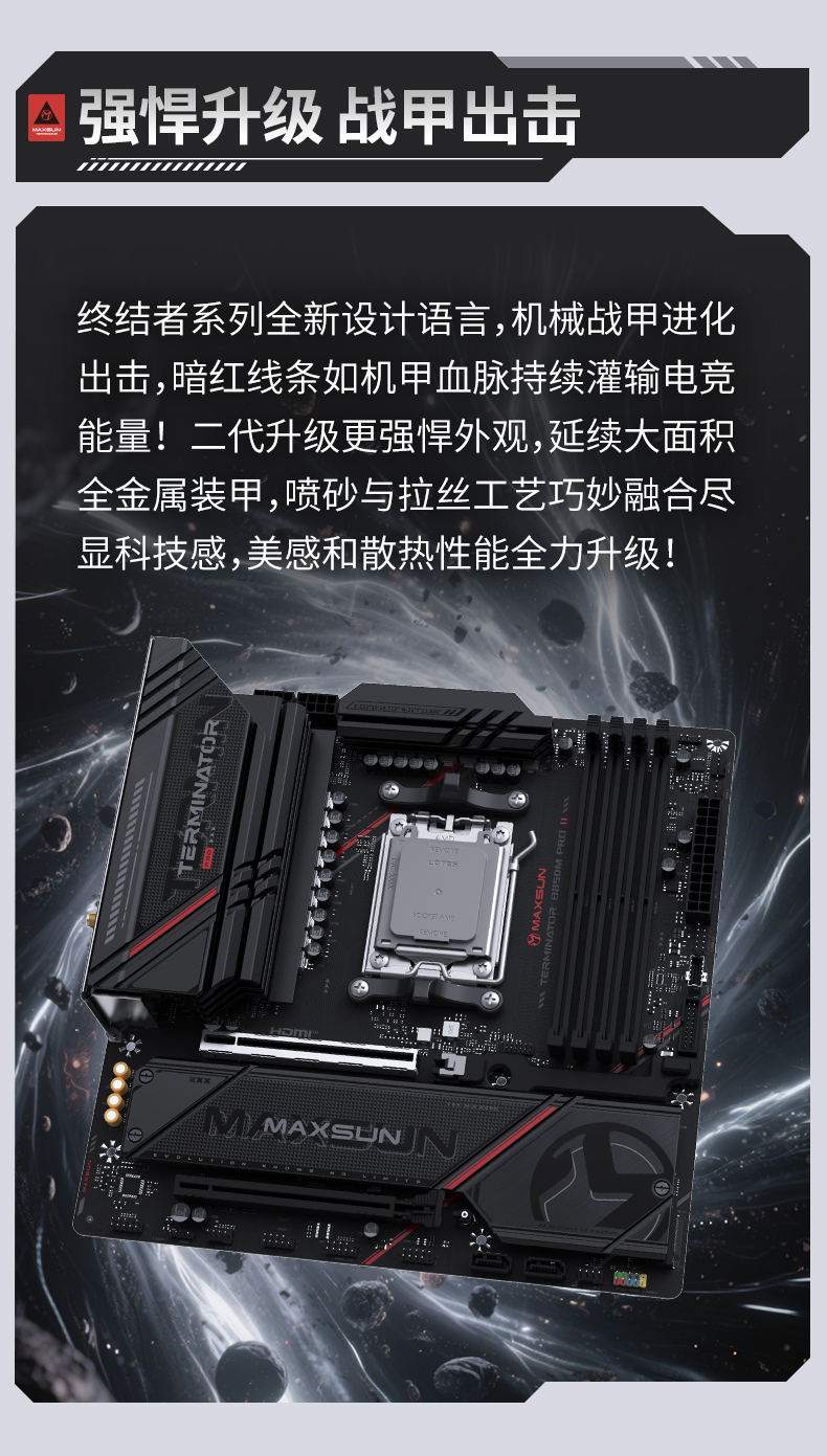 銘瑄Terminator B850M PRO II WIFI7 主板的外觀設計延續了終結者系列的硬核風格,機械戰甲般的散熱裝甲上,暗紅線條如機甲能量脈絡貫穿始終,大面積全金屬裝甲融合噴砂與拉絲工藝,既增強了散熱性能,又帶來具有沖擊力的視覺科技感,無論放入任何機箱中都能成為焦點。