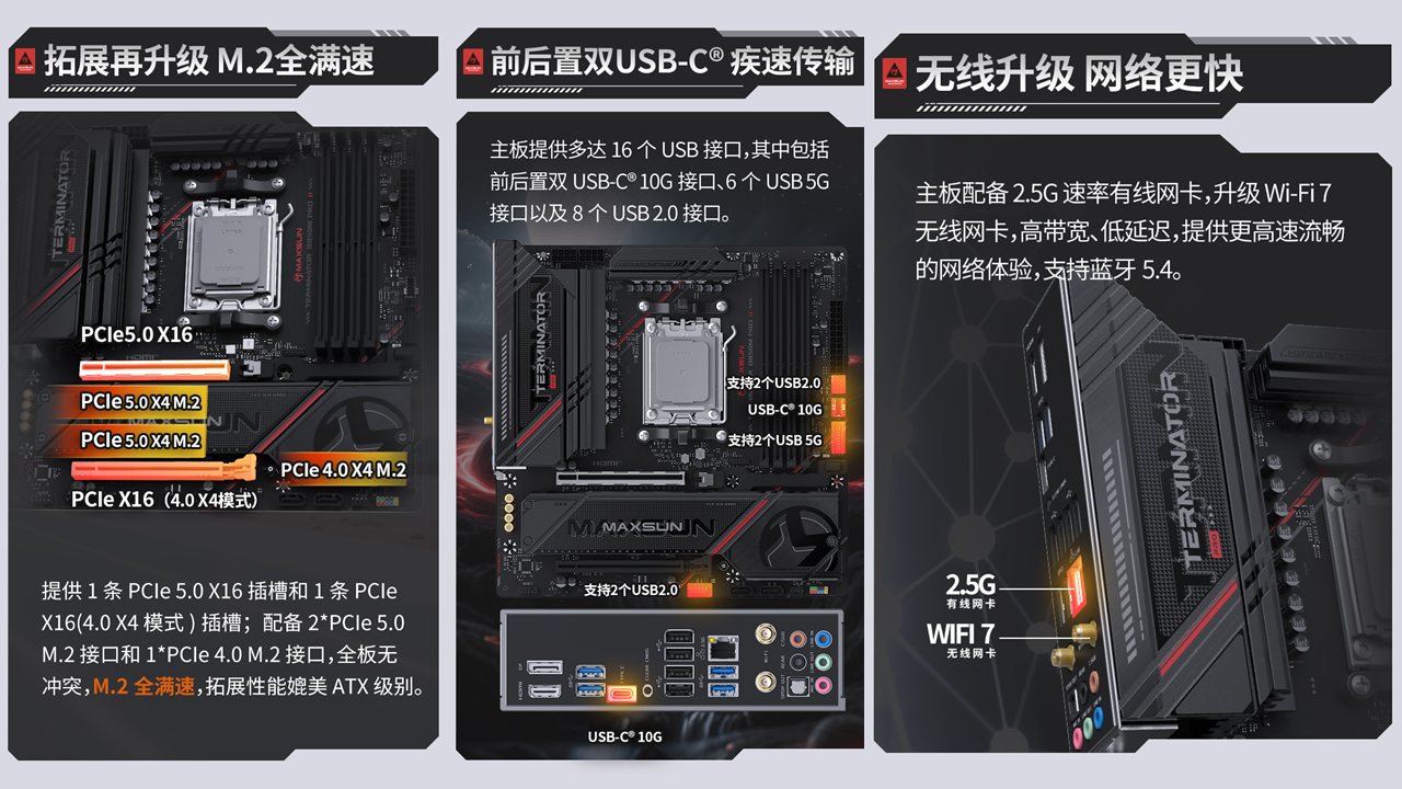 該主板在拓展和網絡方面還進行了升級,主板提供2 個 PCIe 5.0 X4 M.2 接口與 1 個 PCIe 4.0 X4 M.2 接口,全部支持 NVMe 協議,實現M.2全滿速傳輸。同時配備1 條 PCIe 5.0 X16 插槽與 1 條 PCIe X16(4.0 X4 模式)插槽的配置,全板無沖突,拓展性能媲美 ATX 級別,能輕松滿足多設備連接、多場景使用的需求。網絡體驗迎來跨越式升級,原生搭載的 Wi-Fi 7 無線網卡配合 Realtek RTL8125D 2.5G 高速有線網卡,支持藍牙 5.4,高帶寬、低延遲的網絡傳輸,讓AMD銳龍 7 9850X3D 處理器在在線游戲、高清直播、高速下載等場景中都能流暢無憂,盡情發揮性能。