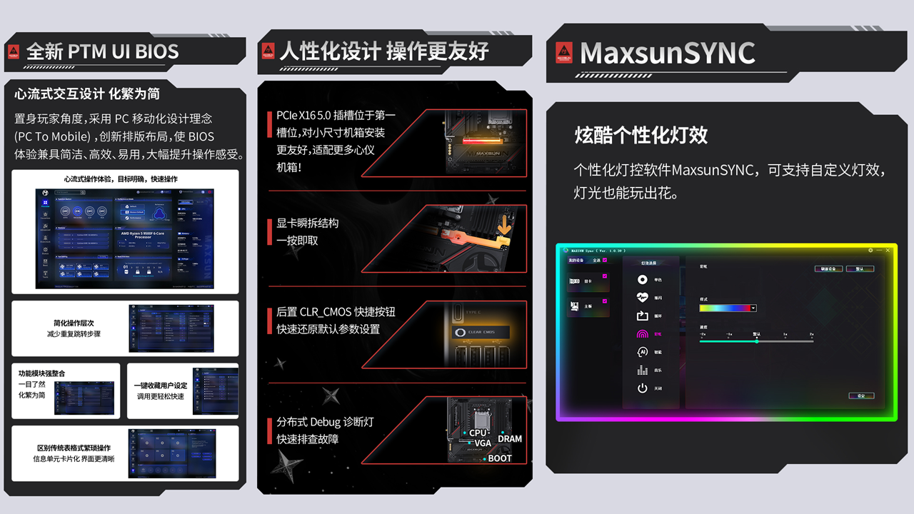 操作便捷性上,銘瑄 Terminator B850M PRO II WIFI7 主板同樣下足了功夫。全新的 PTM UI BIOS 打破傳統操作門檻,采用手機端般的卡片式界面設計,所有交互層級不超過 2 層,新手也能輕松上手調校系統,快速優化AMD銳龍 7 9850X3D 處理器的運行狀態;而顯卡瞬拆結構、分布式 Debug 診斷燈和 CLR_CMOS 快捷按鈕等貼心設計,讓裝機過程更簡單,故障排查更高效,大大降低了使用門檻。此外,個性化燈控軟件 MaxsunSYNC 可支持自定義燈效,單色、音樂律動等多種模式隨心選擇,讓燈光也能玩出獨特個性,滿足玩家的個性化需求。