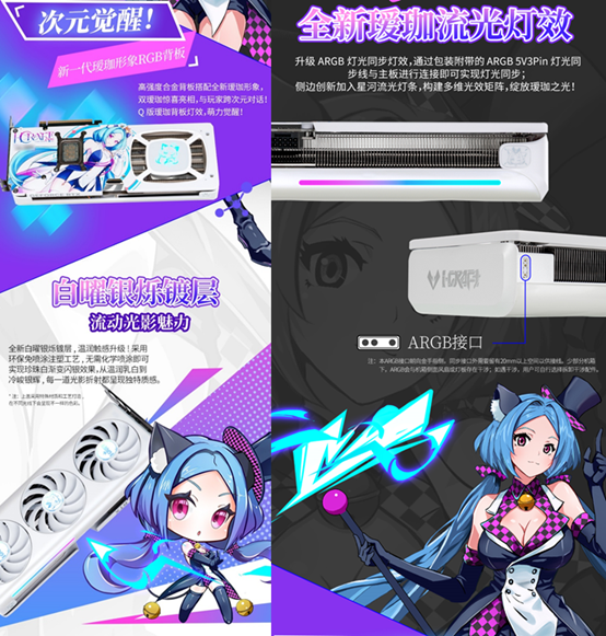 銘瑄 GeForce RTX 5070 iCraft OC12G 璦珈顯卡不僅性能強勁,顏值也十分出眾,高度契合玩家的審美需求。外觀上延續了溫潤質感的設計基調,采用全新白曜銀爍鍍層,通過環保免噴涂注塑工藝,無需化學噴涂即可實現珍珠白漸變閃銀效果,從溫潤乳白到冷峻銀輝,每一道光影折射都呈現出獨特質感。側邊創新加入星河流光燈條,搭配升級的 ARGB 燈光同步燈效,玩家通過包裝附帶的 ARGB 5V3Pin 燈光同步線與主板連接,即可實現燈光同步,燈光流轉間如同賽博世界的魔法光芒,靈動又吸睛。高強度合金背板不僅為顯卡提供了穩固防護,防止顯卡因自重而彎曲,還搭載了 Q 版璦珈燈效,萌力與科技感完美融合,讓顯卡即便靜置時,也能成為桌面一道亮眼的風景。